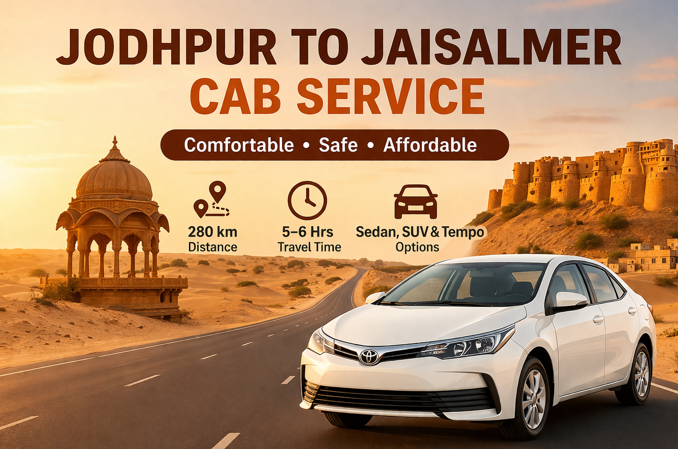 The distance between Jodhpur and Jaisalmer is around 280 km, and it usually takes 5 to 6 hours depending on traffic and stops.